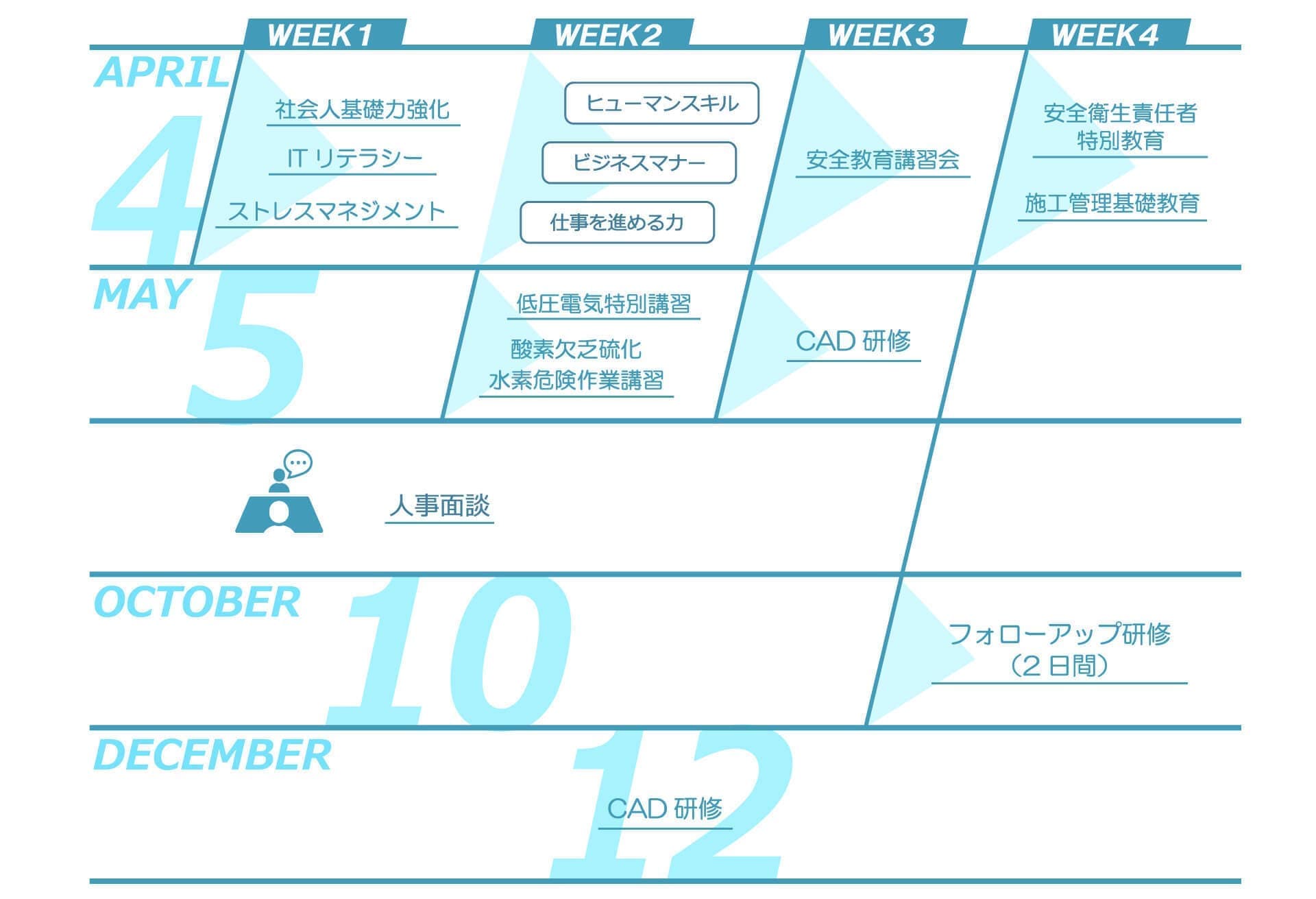 入社1年目の社員研修は、年間80日。自律型人材に成長するために必要なマインドを醸成し、ビジネス能力の基盤を形成します。
